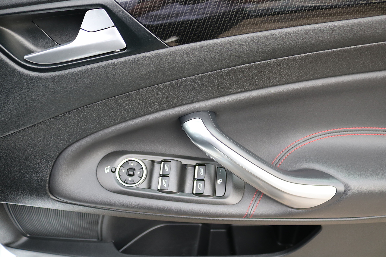 • Leather Trimmed Steering Wheel with Metal-finished spokes with red-contrast stitching